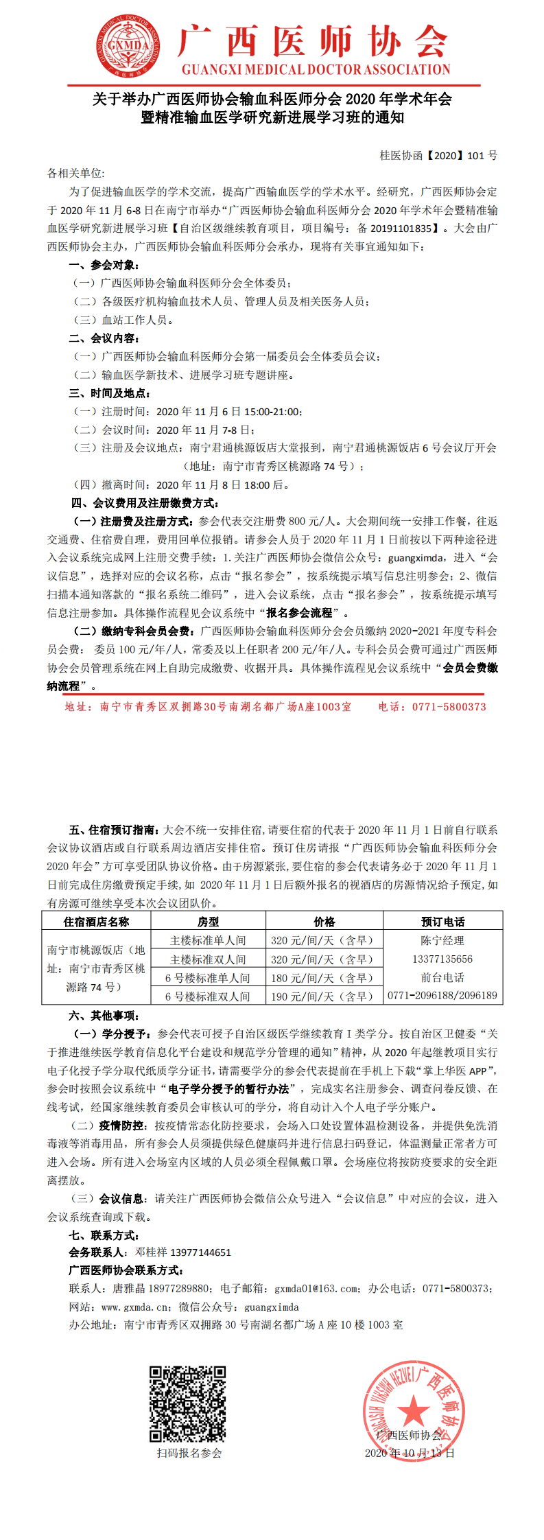 【2020】101 号关于举办广西医师协会输血科医师分会 2020 年学术年会暨精准输血医学研究新进展学习班的通知