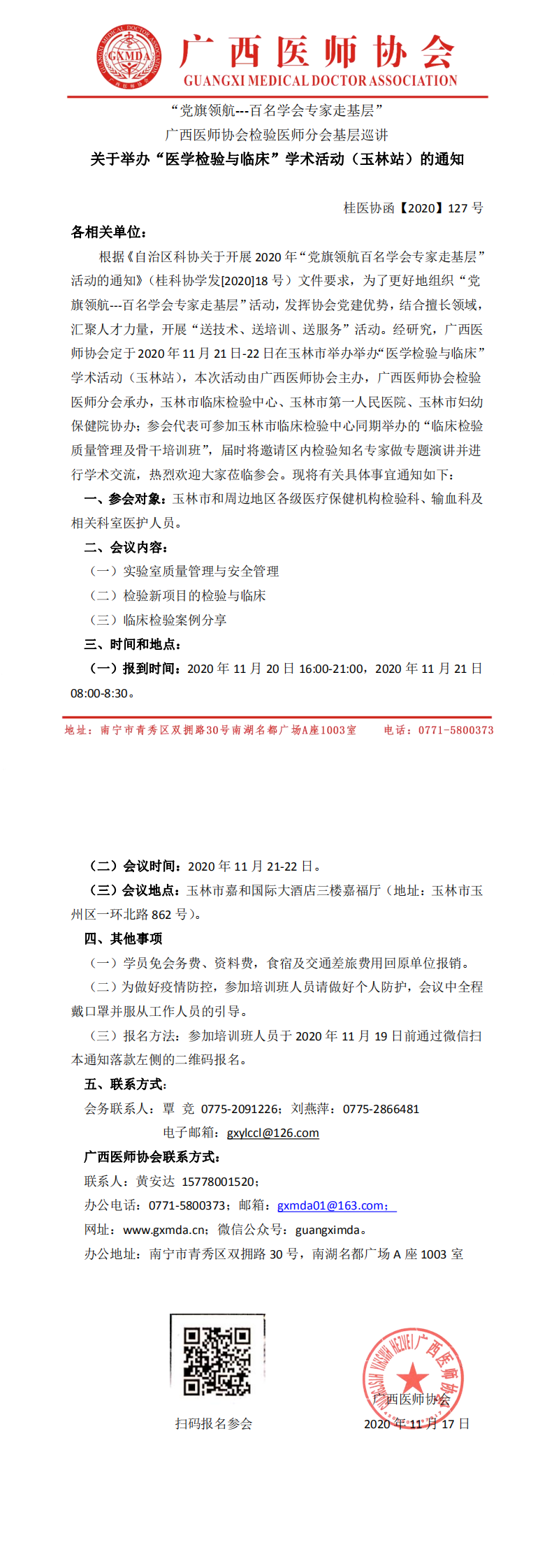 【2020】127 号 广西医师协会检验医师分会举办“医学检验与临床”学术活动(玉林站)的通知(玉林站).pdf