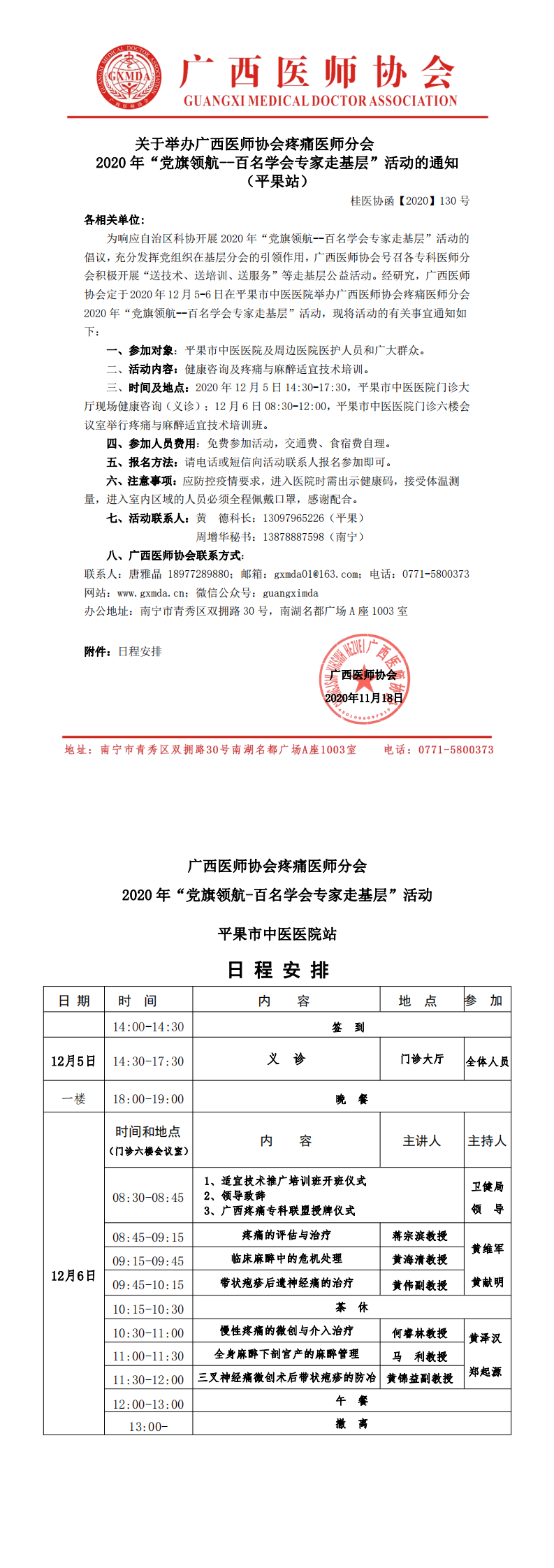【2020】130号 疼痛医师分会2020年“党旗领航--百名学会专家走基层”活动通知(平果站)