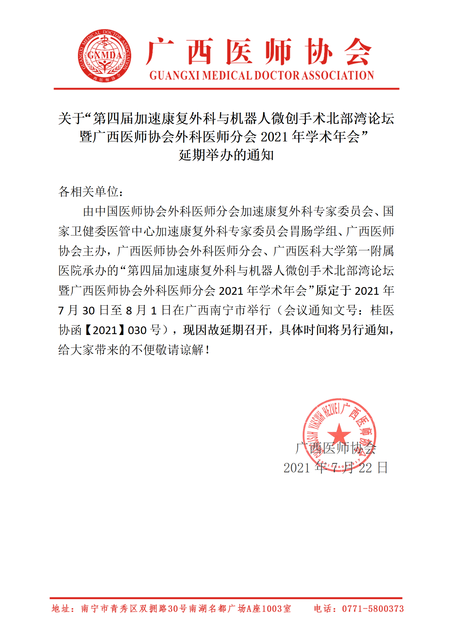 关于第四届加速康复外科与机器人微创手术北部湾论坛暨广西医师协会外科医师分会2021年学术年会延期举办的通知