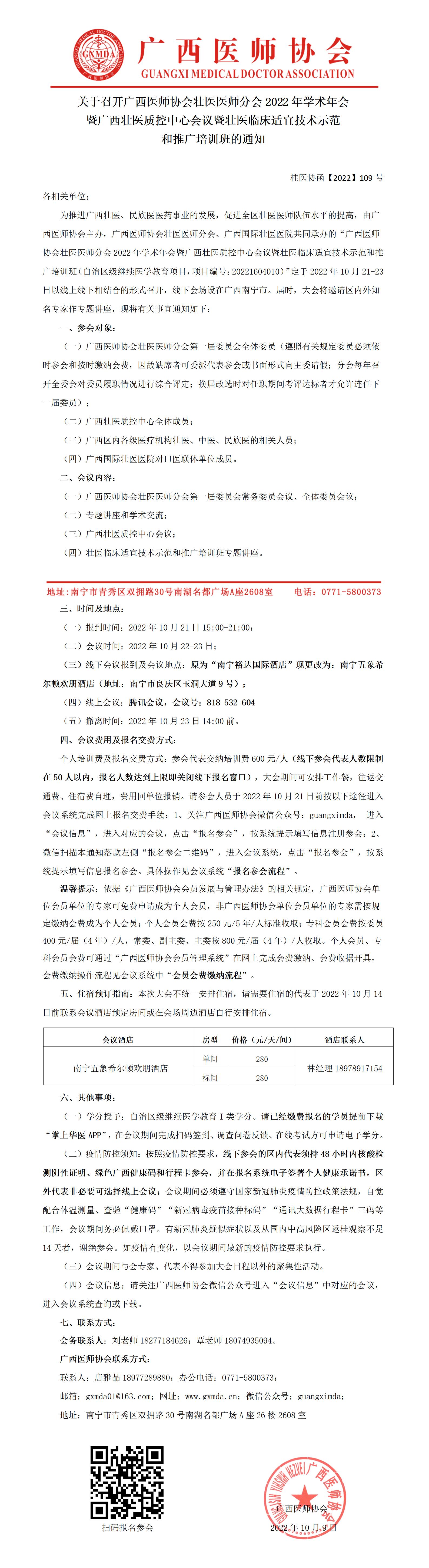 【2022】109号 关于召开广西医师协会壮医医师分会2022年学术年会暨广西壮医质控中心会议暨壮医临床适宜技术示范和推广培训班的通知.pdf